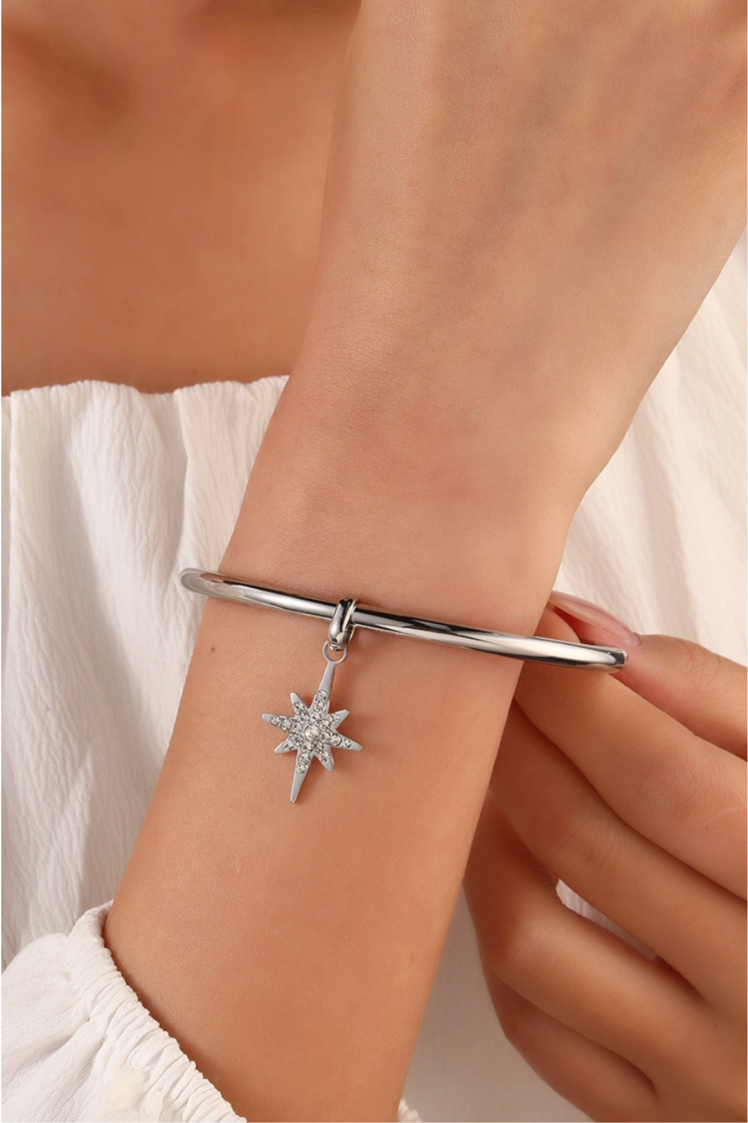 Ce bracelet jonc est fabriqué en acier inoxydable de haute qualité, reconnu pour sa durabilité et sa résistance à l’eau. Sa structure rigide et lisse épouse délicatement le poignet tout en garantissant un excellent confort au porté. Le jonc est sublimé par une breloque étoile polaire finement travaillée, sertie de cristaux scintillants qui captent la lumière avec élégance.